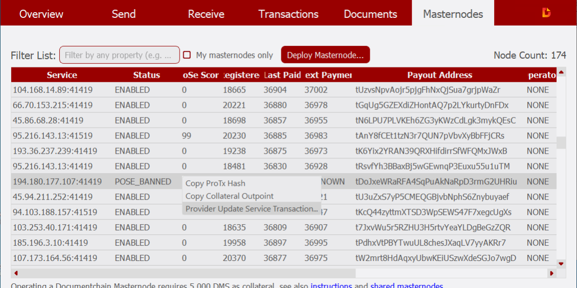 Zur Reaktivierung des Masternodes muss eine Provider Update Service Transaction (ProUpServTx) gesendet werden. Dies geschieht im lokalen Wallet, mit dem Ihre Masternodes gesteuert werden: